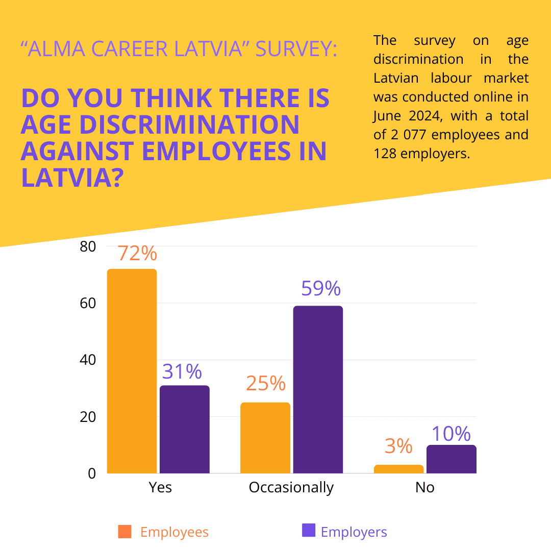 "The survey results clearly show that age discrimination is a significant issue that hinders labour market growth and limits the potential of organizations, losing valuable human resources and the opportunity to take full advantage of diversity and inclusion benefits. Given the aging population and the increasing competition for talent, employers should promote age inclusiveness by focusing on assessing employees' skills and competencies to ensure a fair and diverse working environment. This requires employees to continuously learn and improve their skills to remain competitive in the labour market. There is also a need for greater government involvement in promoting lifelong learning and retraining initiatives and tax incentives for employers hiring older workers," says Aivis Brodiņš, CEO of Alma Career Latvia.
